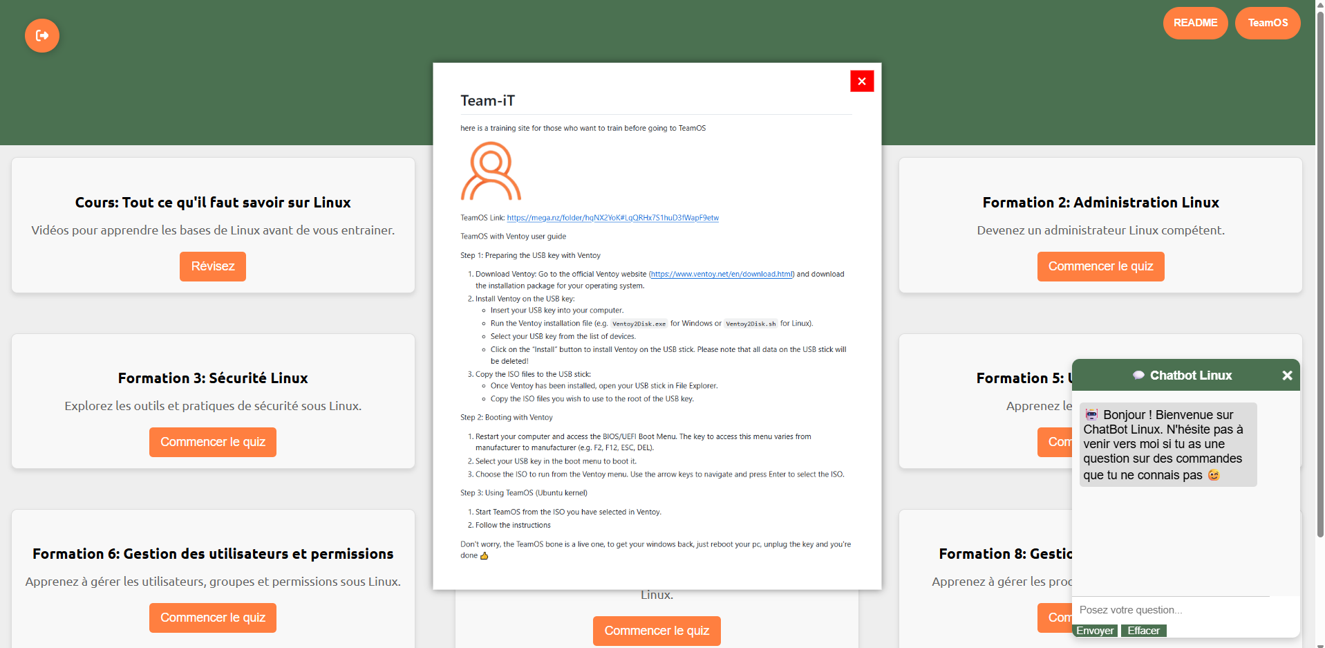 Création d’un site web de formation Linux visant à rendre l’apprentissage plus accessible et interactif. Le site regroupe des cours et des exercices issus de plusieurs sources fiables, organisés de façon claire et progressive. Le frontend a été développé en HTML, CSS et JavaScript. Un chatbot a été intégré pour assister les utilisateurs, répondre aux questions courantes et guider la navigation. Ce projet m’a permis de consolider mes compétences en développement web, structuration pédagogique, intégration d’assistants interactifs et en gestion de contenu autour des distributions Linux (Ubuntu, Debian, Mint, etc...).